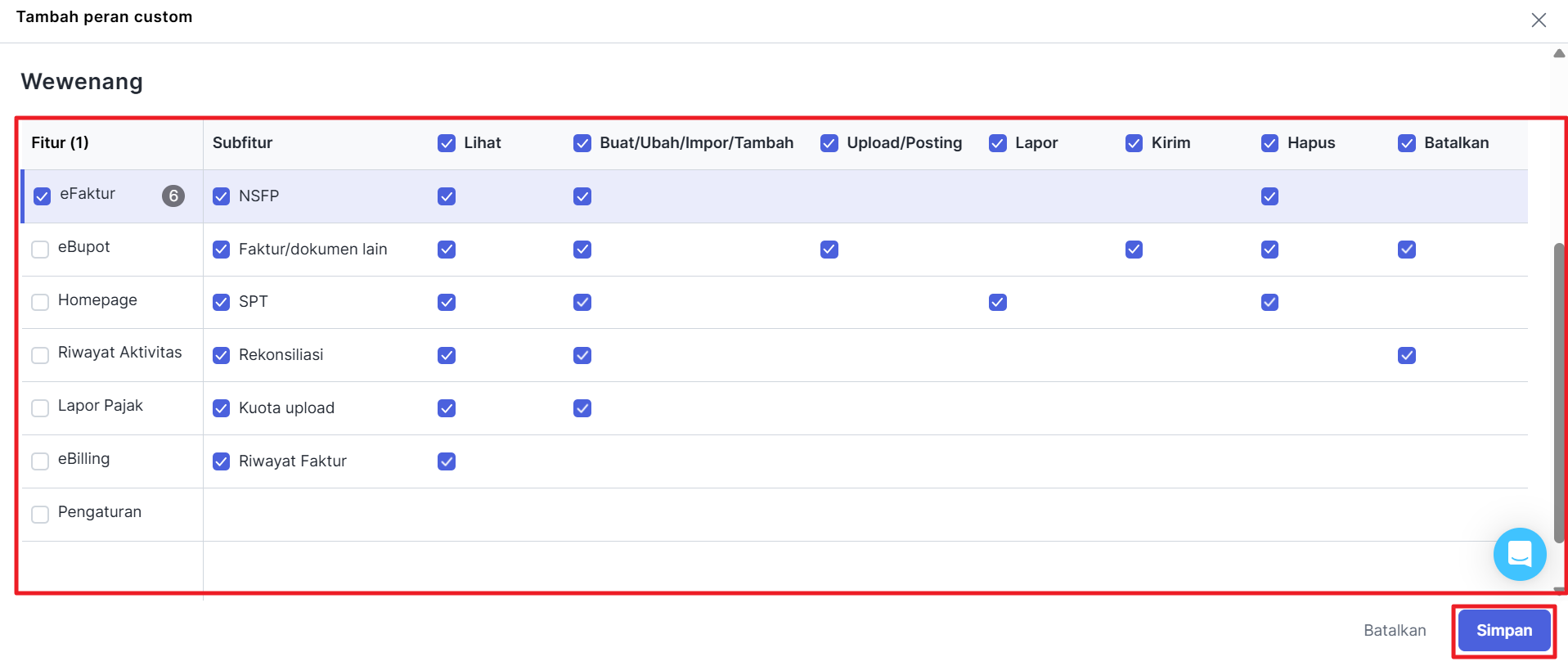 5. Pilih fitur dan subfitur yang dapat diakses serta wewenang dari pengguna atas fitur tersebut. Jika sudah klik "Simpan".