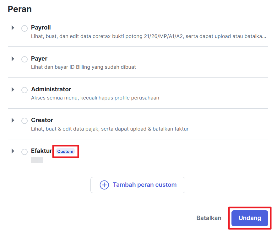 4. Kemudian klik “Tambah peran custom” pada bagian Peran. Dan Anda akan diarahkan ke pop-up Tambah peran custom dan dapat mengulangi langkah 2 - langkah 6 pada bagian atas.
