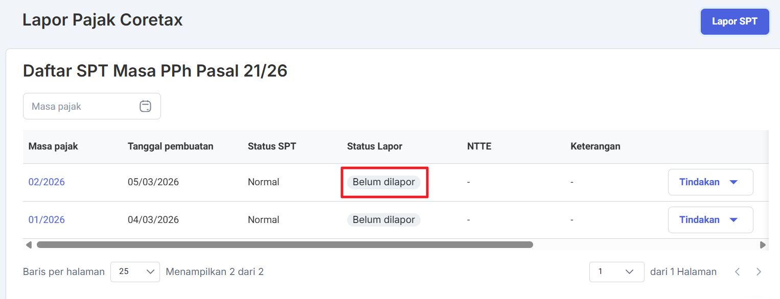 Anda akan melihat status pelaporan ‘Diproses ke DJP’ hingga SPT Anda terbentuk. Setelah SPT Anda sudah terbentuk, maka Anda akan melihat status pelaporan ‘Belum dilapor’.