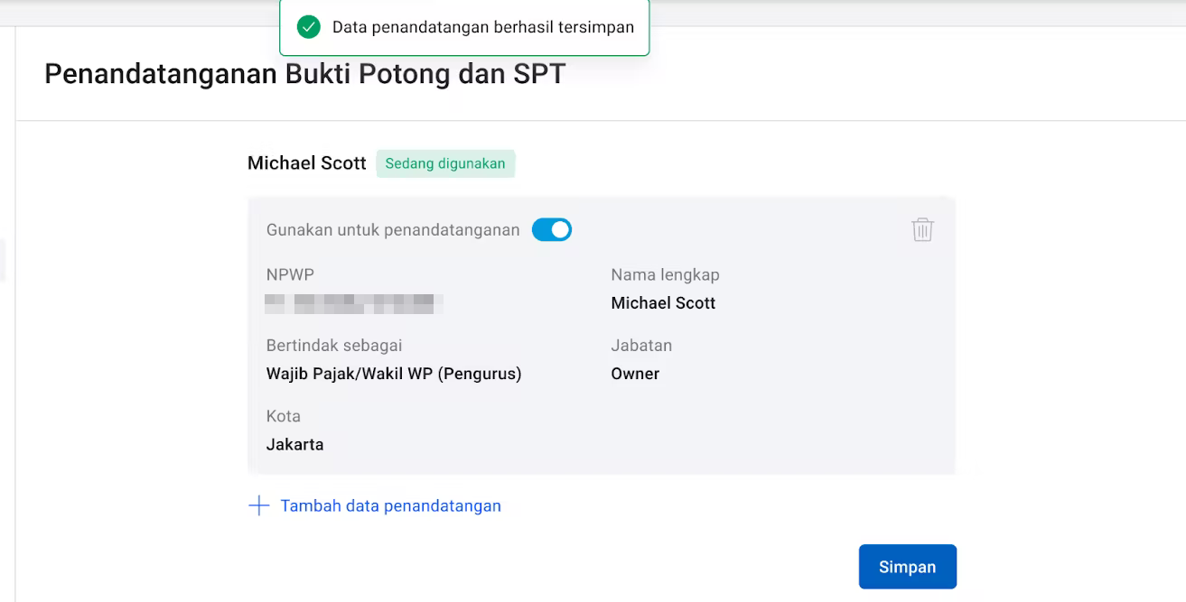 E-Bupot Unifikasi memungkinkan Anda untuk memiliki lebih dari 1 data penandatanganan, namun hanya 1 yang dapat diaktifkan.