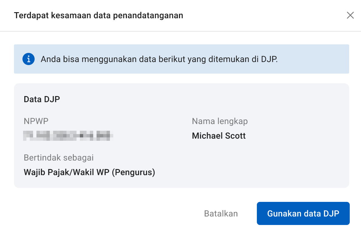 Apabila terdapat data Anda yang pernah tersimpan sebelumnya di DJP, pop up akan muncul dan Anda dapat memilih untuk menggunakan data sebelumnya atau data yang baru diinput untuk digunakan sebagai penandatanganan.