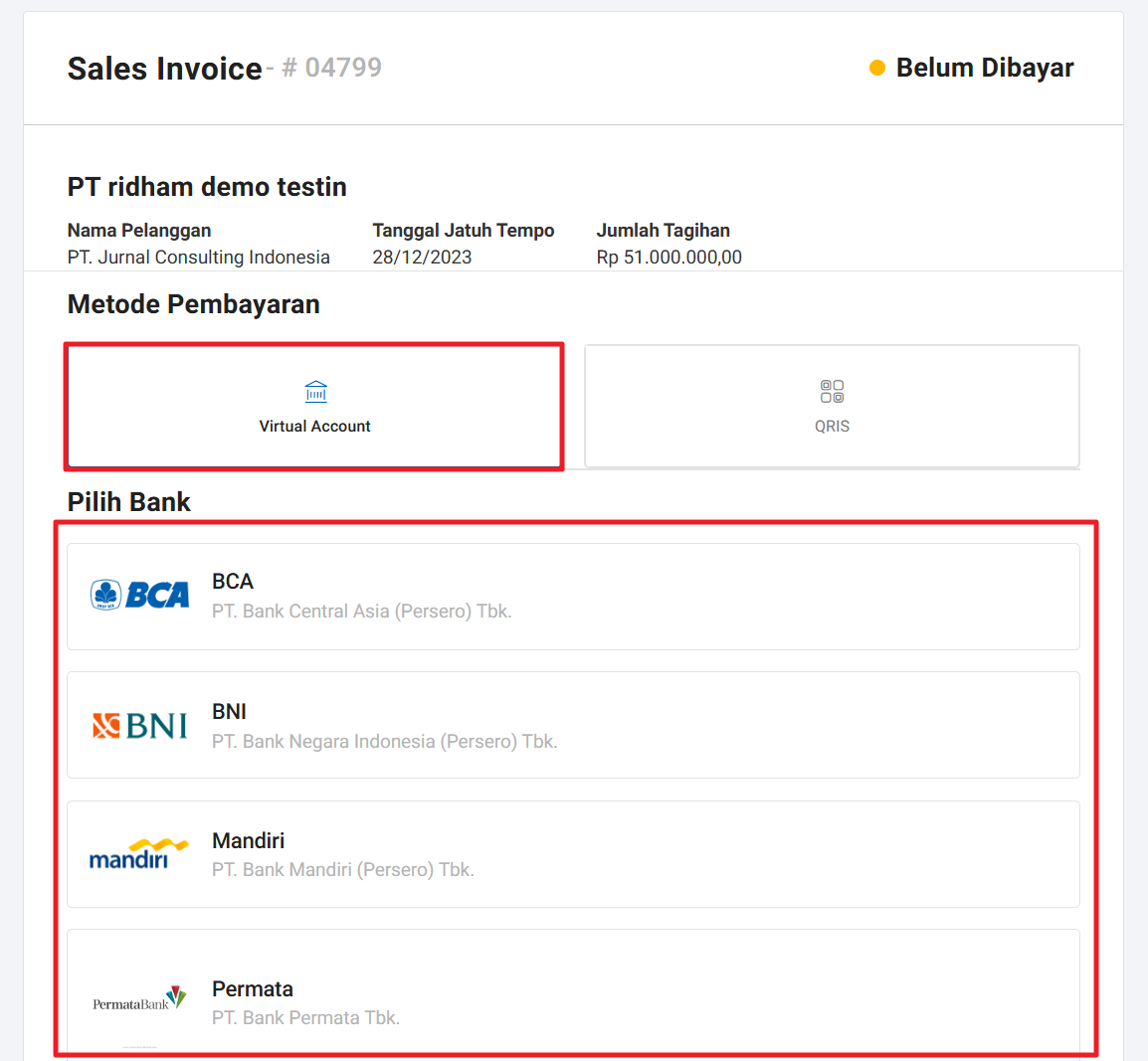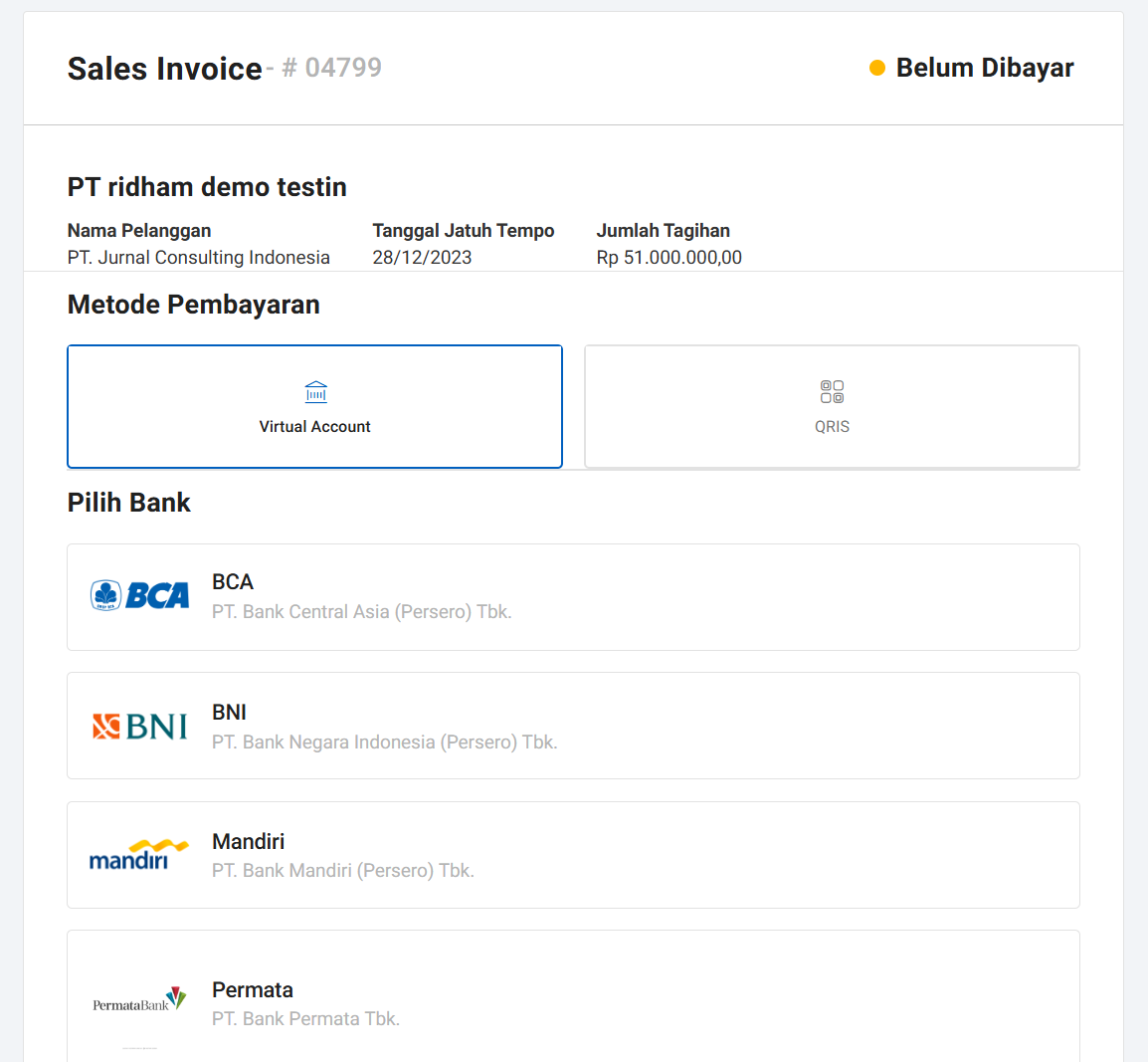 Virtual Account: Pembayaran sama atau antar Bank bisa Anda lakukan melalui opsi ini, tersedia Virtual Account Bank BNI, Mandiri, dan BRI.