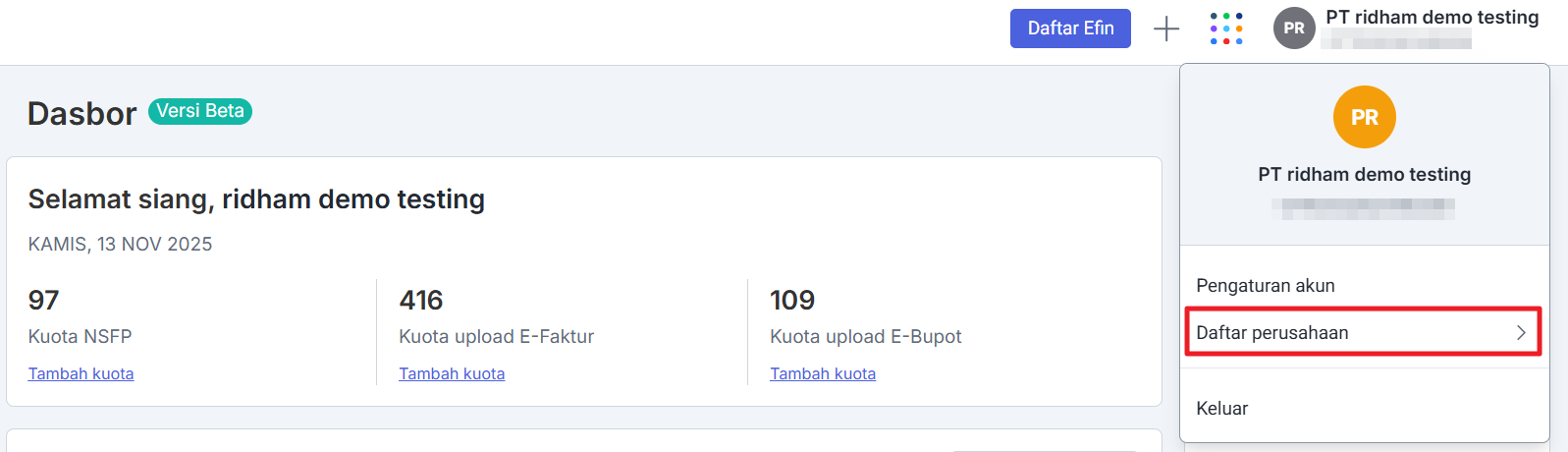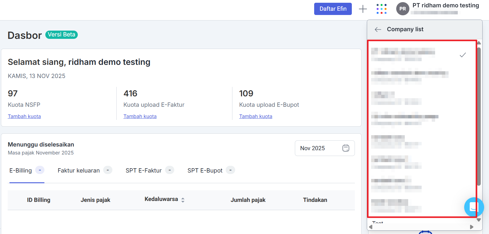 Jika Anda memiliki lebih dari 3 Perusahaan, klik "Daftar perusahaan" untuk menampilkan semua daftar perusahaan yang Anda kelola.