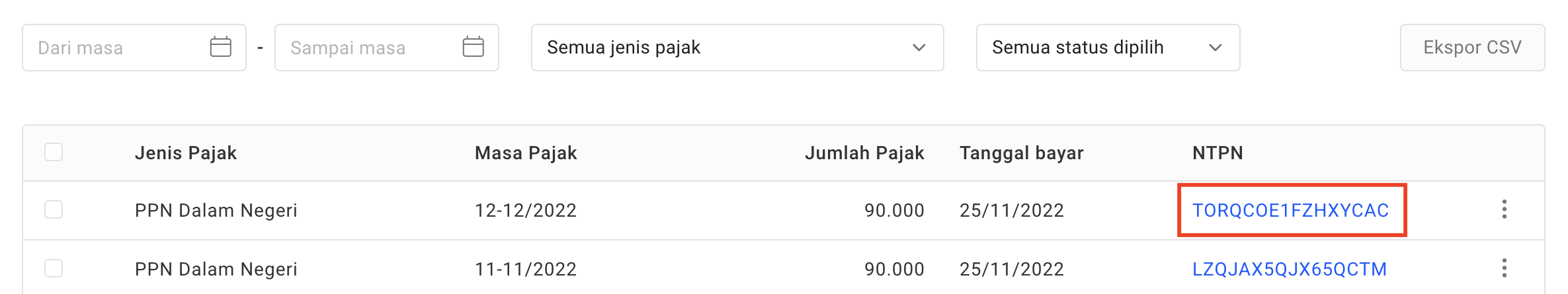 - Lalu klik nomor NTPN yang Anda inginkan.