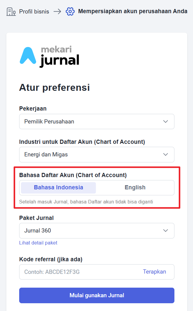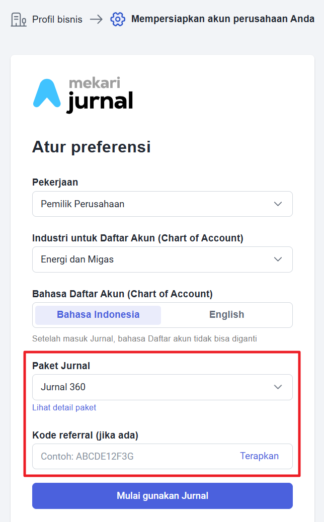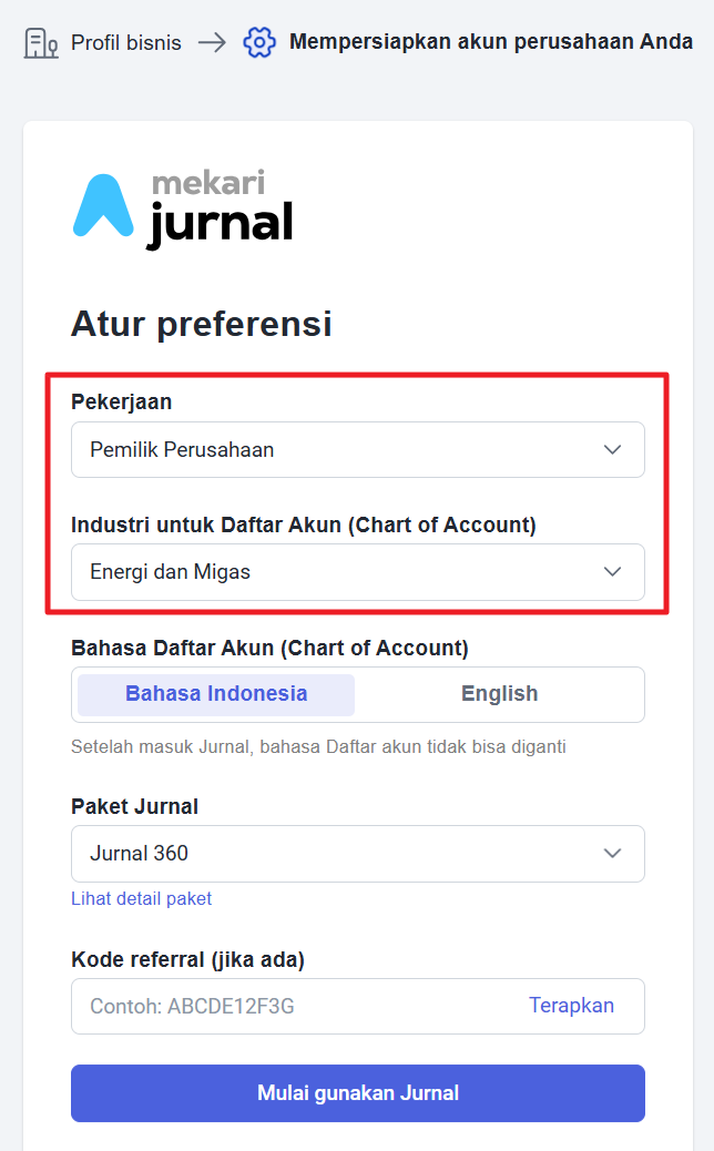 - Pemilihan industri akan mempengaruhi daftar akun yang terbentuk. Pilih juga jenis paket yang akan digunakan serta masukkan kode referral jika ada.