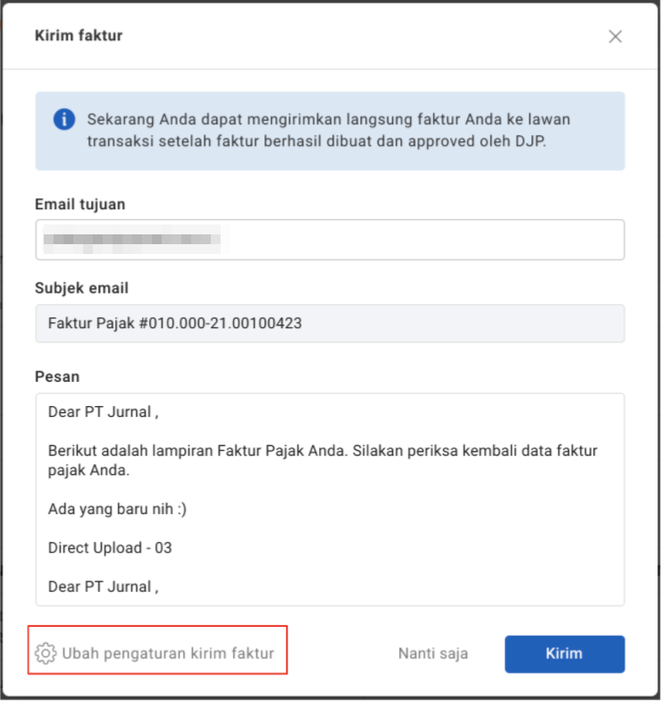 Secara default, otomatisasi pengiriman faktur keluaran dinyalakan. Sehingga, setelah faktur keluaran berhasil diunggah ke DJP, akan muncul pop-up pengiriman faktur keluaran ke pelanggan.